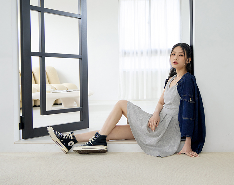 Pentagonal neckline / Slimming waist design / Flowing pleats