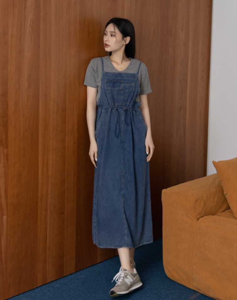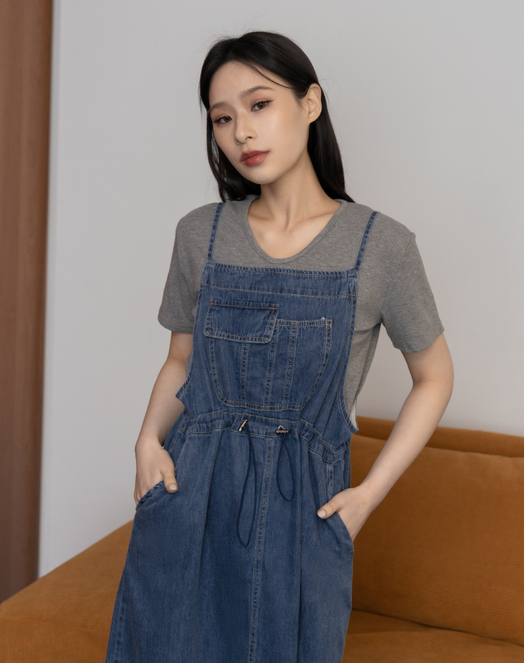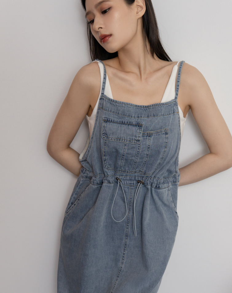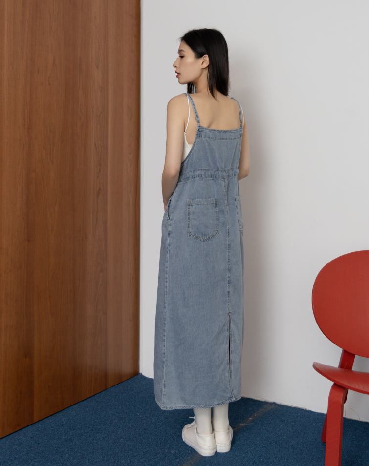 WASHED POCKET DETAIL DENIM DUNGAREE DRESS