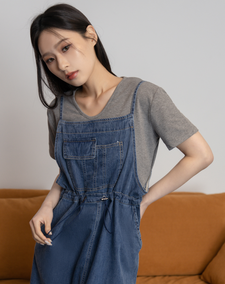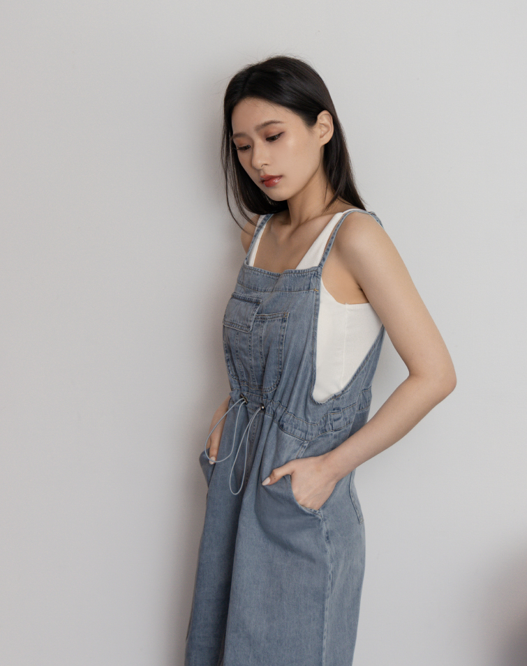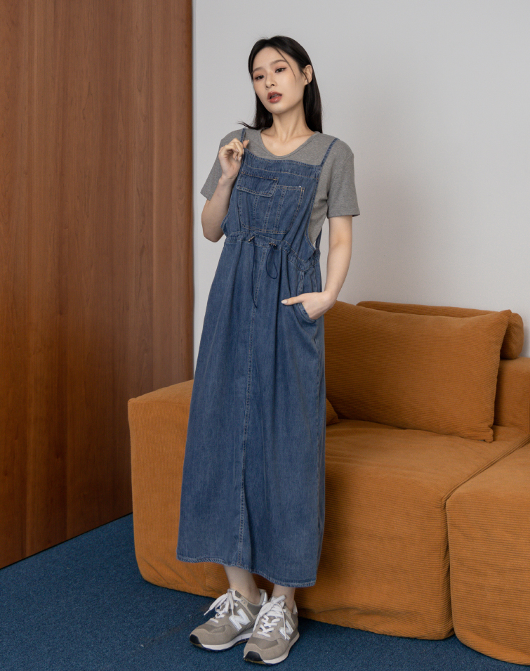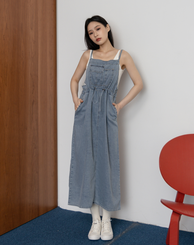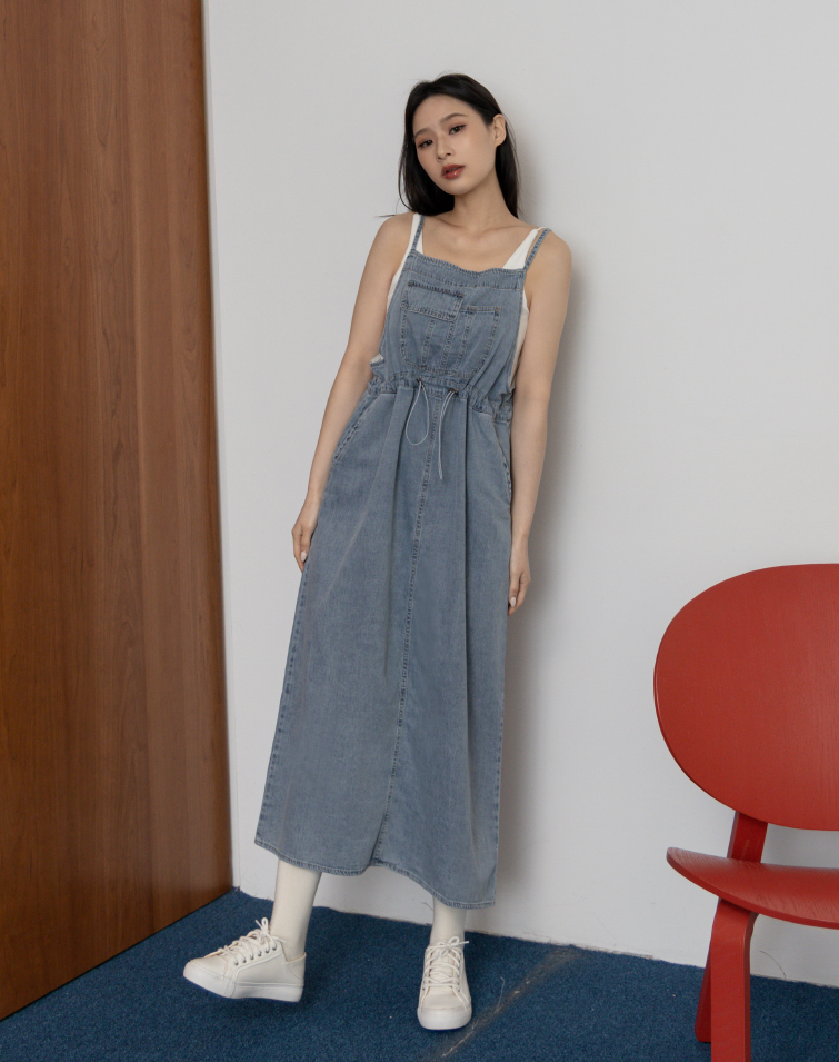 WASHED POCKET DETAIL DENIM DUNGAREE DRESS